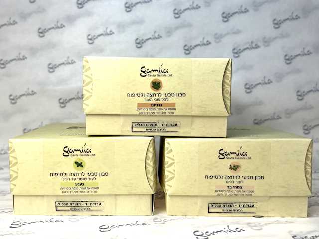 מארז המכיל 3 סבוניo טבעיים של סבתא גמילה באריזה הישראלית , סבון צמחי בר , סבון גירניום , סבון נענע