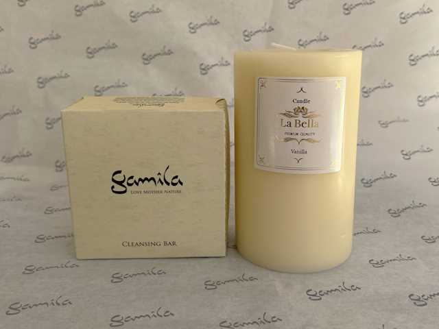 מארז עדין ומשמח - מכיל סבון בניחוח לבנדר באריזה מיוחדת ונר ריחני איכותי בגודל 8/15 ס"מ